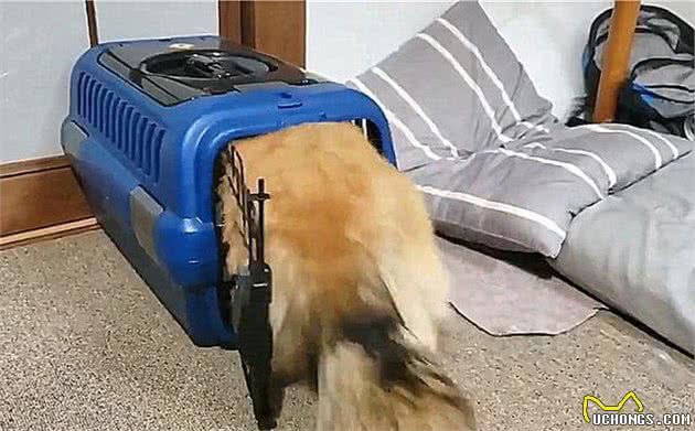 53斤喜乐蒂犬试图钻回幼时航空箱,结果笼子却不堪重负被撑坏