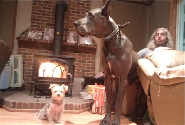 这只体型庞大的犬来自加拿大的一座小城,品种是丹麦犬俗称大丹犬。它们是世界上体型最大的犬种之一。目前最高大的犬的世界纪录就由丹麦犬保持的,创造这项世界纪录的丹麦犬直立身高2.2米,比很多篮球明星还要高。