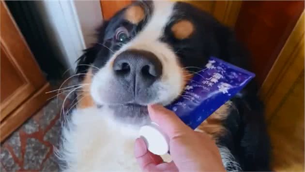 这天汉堡又趁主人不注意,到厕所里偷咬洗面奶。虽然这支洗面奶表面看起来没什么问题,但主人一挤,发现洗面奶从尾部的口子出来了!
