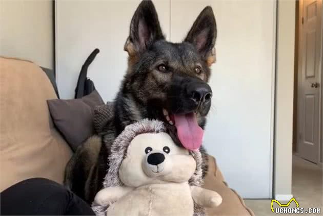 其实不只大金毛会依赖自己的玩具,看看这只外表凶凶的狗狗,怀里可是抱着一个可可爱爱的玩具呢,也真是反差萌了。