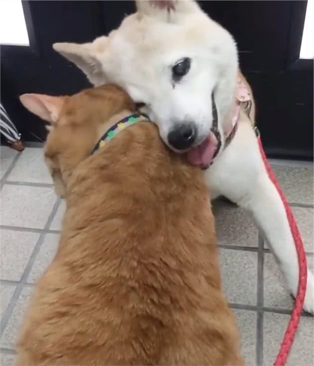 应对橘猫的激情迎来,柴犬内心也乐滋滋的,它脸部漏出了灿烂的笑容?。除开用脑壳蹭之外,橘猫还?不断接吻柴犬的脑壳。
