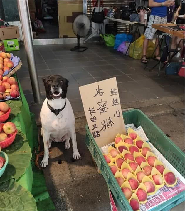 原来这只狗狗叫阿麦,经常黑着一张脸,但却满脸笑容的陪主人卖水果。