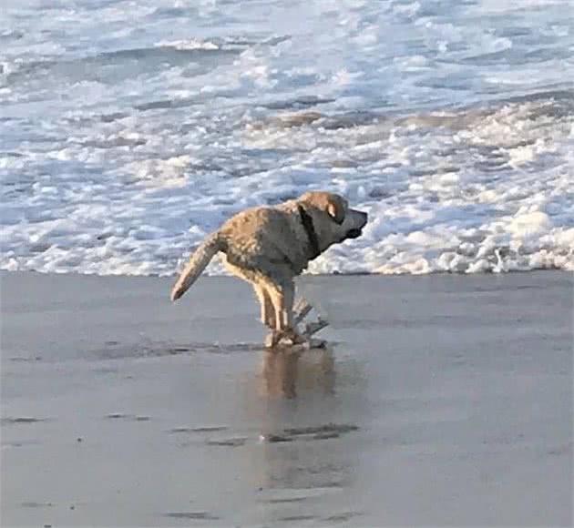 这只刚从水里出来的狗感觉像一条蛇从河里爬出来,看不到尾巴。海滩上的金毛猎犬也是如此。乍一看,它认为这是金毛猎犬和香肠犬的杂交品种,香肠犬的基因太强大了。
