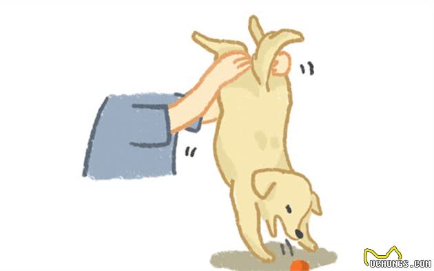 3.如果异物较为深入,铲屎官无法直接将其取出,那就可以把狗狗的头部向下臀部向上,保持前低后高的姿态,然后用手拍打狗狗的背部。或者将狗狗后腿抬起,让它身体倾斜吐出异物。
